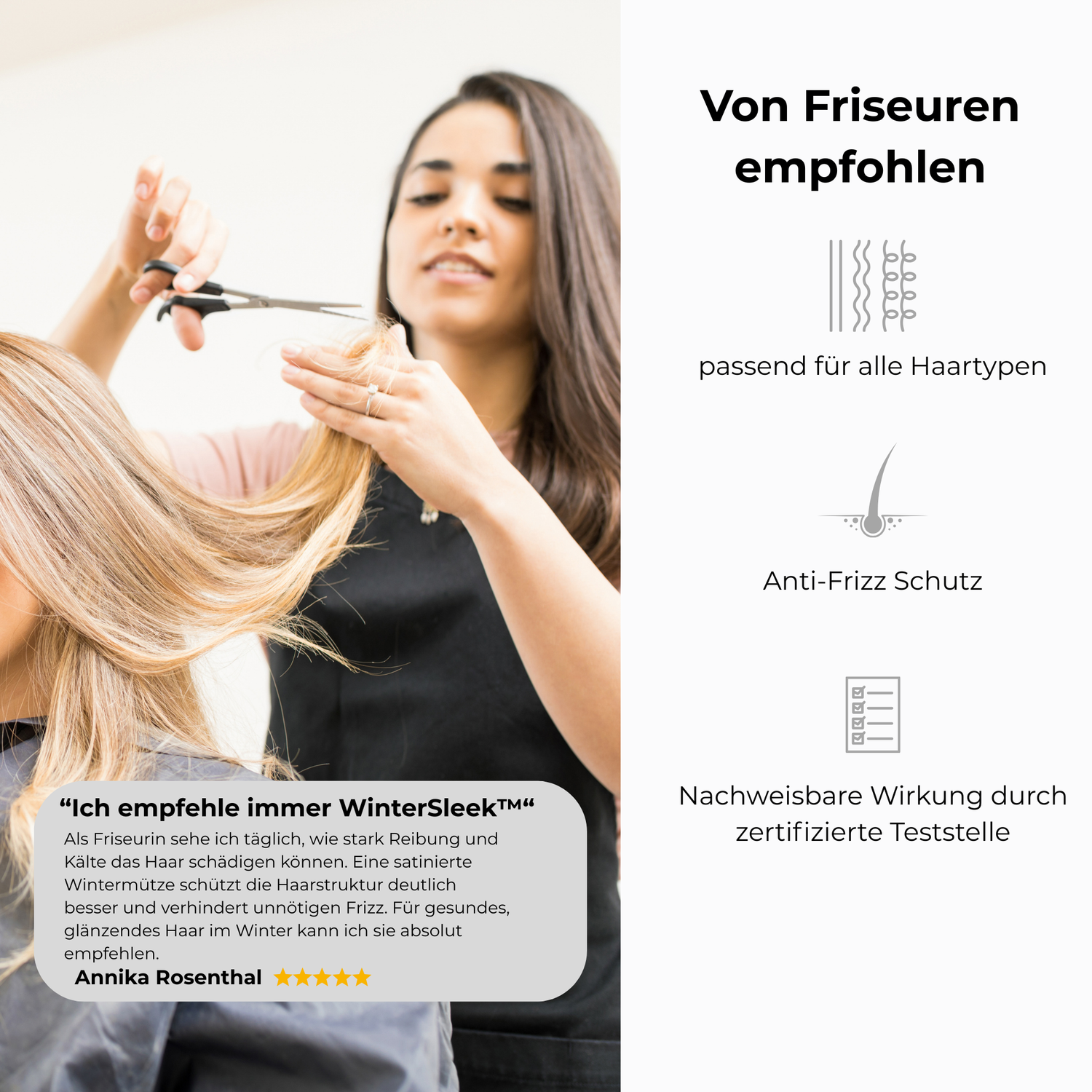 Professionell bestätigt: Unsere satin-gefütterte Mütze schützt dein Haar, reduziert Haarbruch und bewahrt dein Styling selbst an langen Wintertagen – empfohlen von echten Expertinnen.